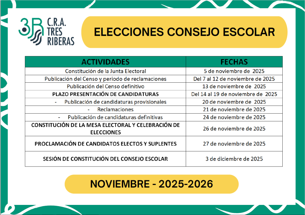 Este curso escolar en nuestro centro, renovaremos de forma parcial el Consejo Escolar mediante nuevas elecciones que tendrán lugar el 26 de noviembre. Será necesario elegir dos nuevas personas representantes de las familias y además, suplentes.
